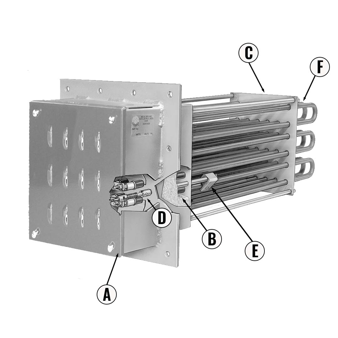 The heavy duty frame is composed of a 1/4 inch (6 mm) thick steel mounting flange, stainless steel support plate and corner posts to securely hold the heating elements rigid in any mounting position.