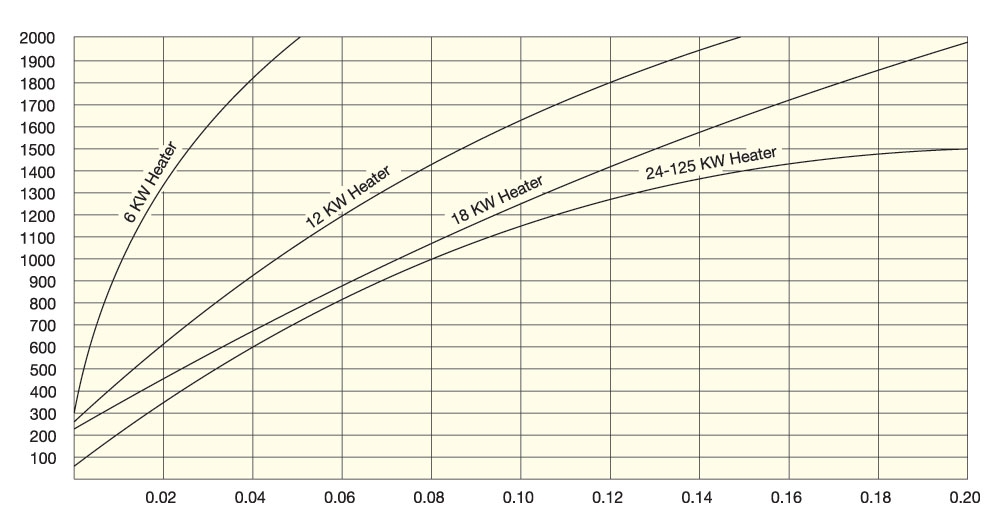 Use graph (English or Metric) to plot Pressure Drop vs. Air Velocity for standard duct heater sizes used to properly Size Blowers.