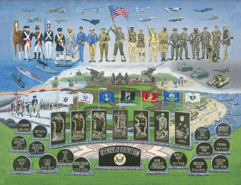 The third painting, Defenders of Our Freedom, was commissioned to honor the men, women and animals (dogs and horses) who have served in the armed forces, winning and preserving our freedoms. Fermin was a veteran, and he felt a special respect for those who put everything on the line, including their lives, for all of us.