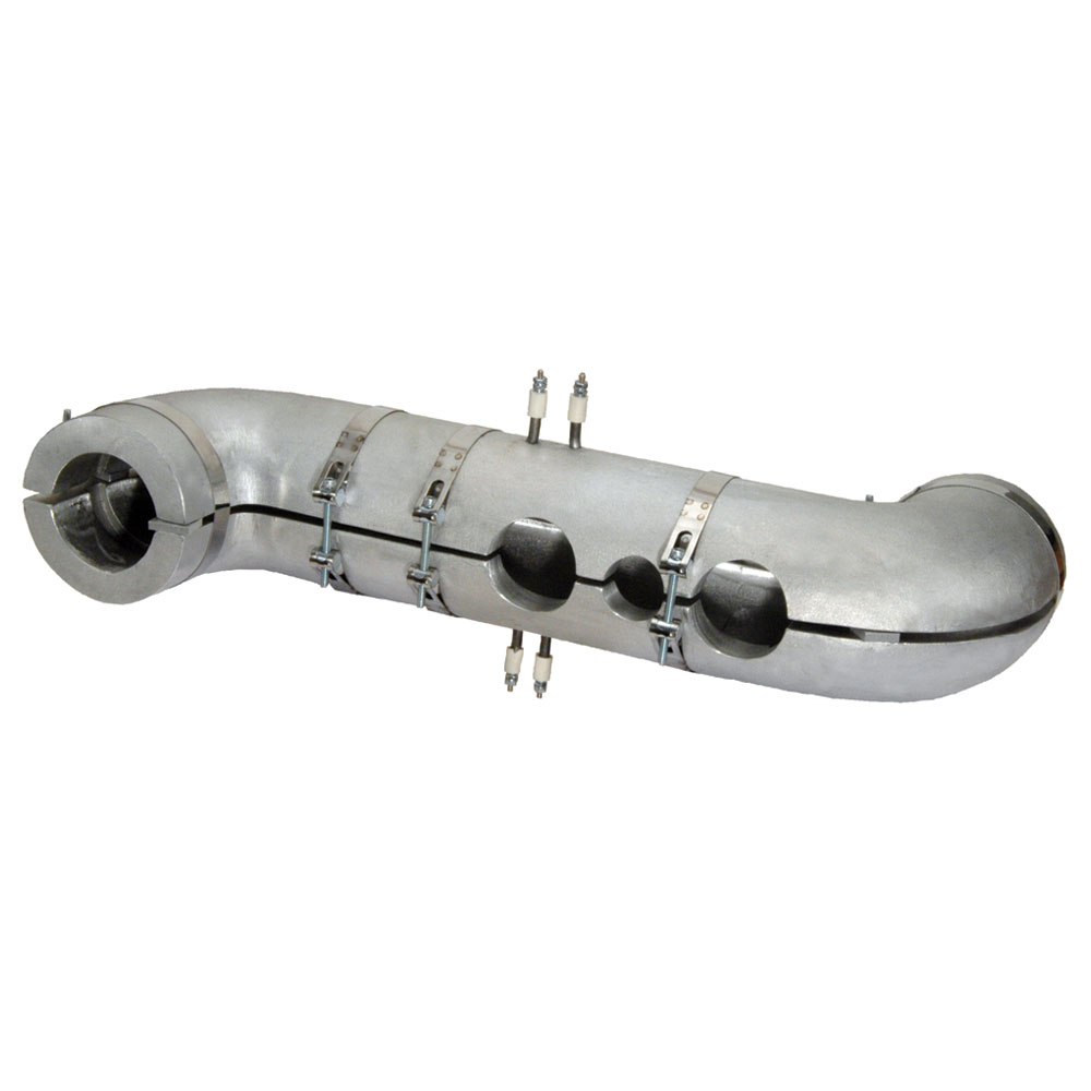 Transfer pipes used in large-scale extrusion lines are difficult to heat because of their irregular geometry. They are not machined cylinders so proper contact and heat transfer are difficult to achieve. Consequently, a special Cast-In Heater must be engineered for each pipe to accommodate its individual characteristics. Typically, this entails the customer sending the pipe to Tempco and our Engineering staff designing a Cast-In Heater System that will optimally fit the pipe. The quality of the process will be improved because hot spots and/or unevenly heated surfaces can be eliminated. In some cases, we cast the heater directly onto the pipe.