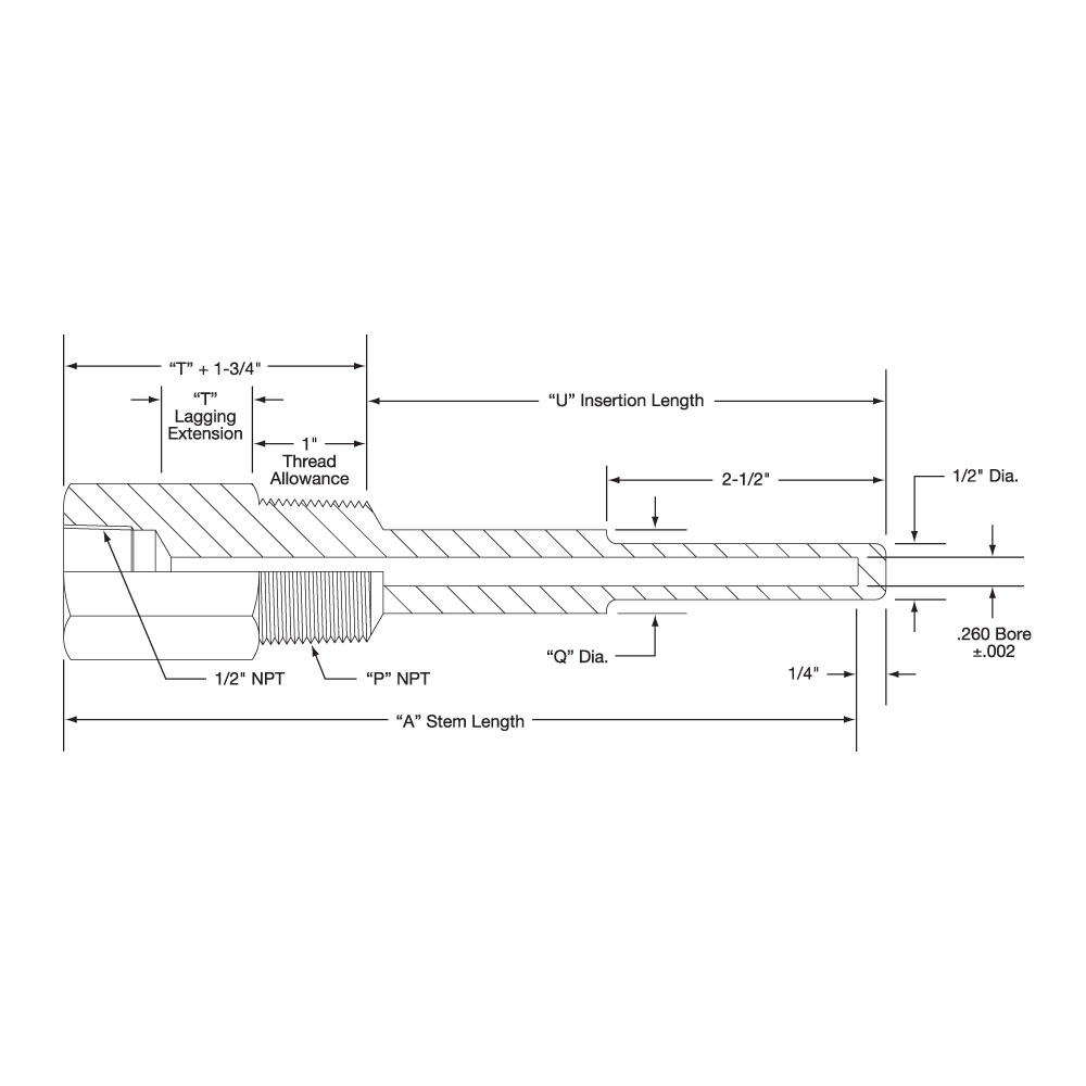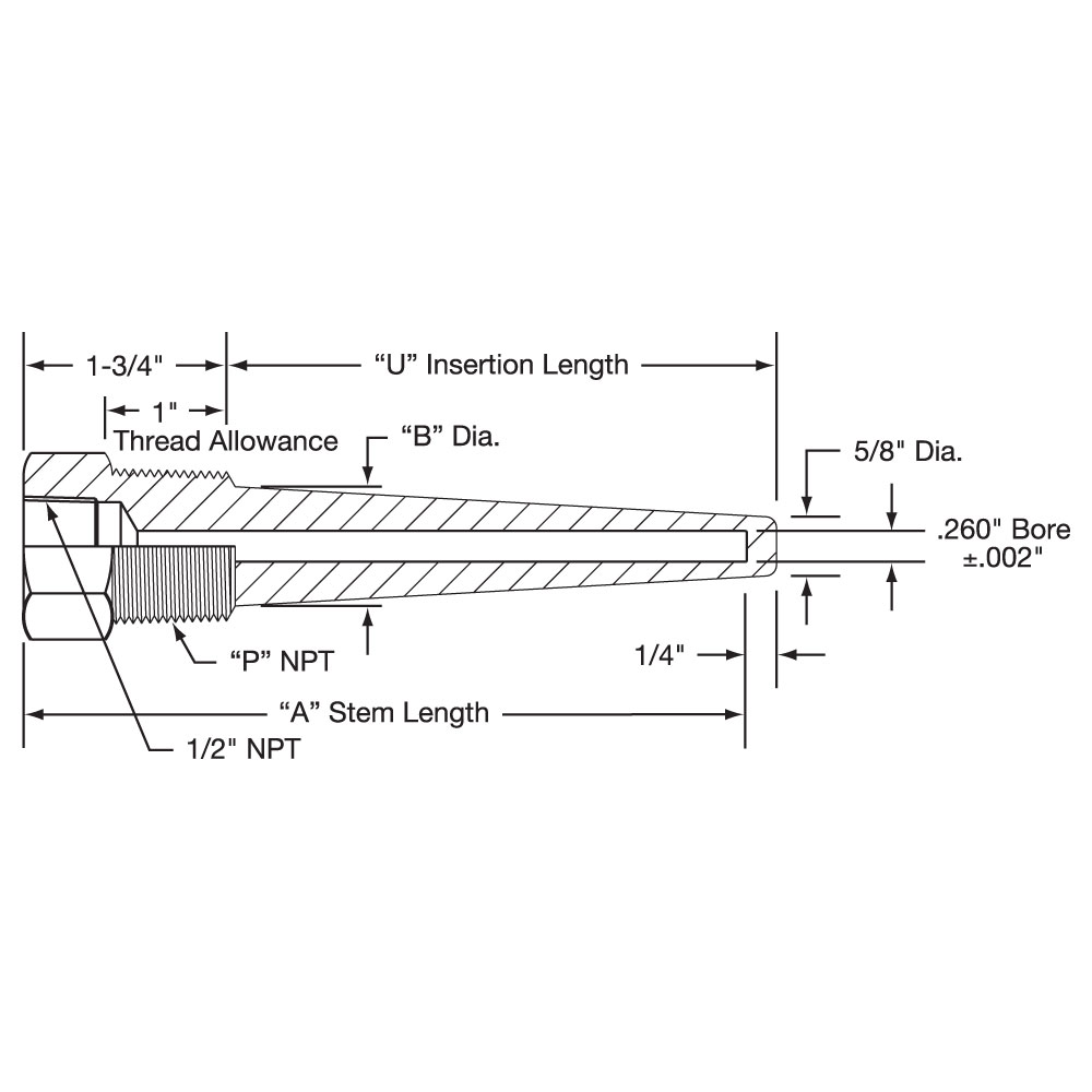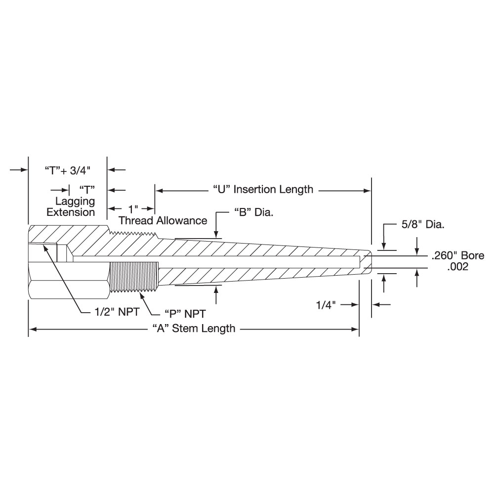 Series 25 Tapered Shank-Lagging Extension Type with .260″ Bore for 1/4″ Diameter Elements Heavy Duty ThreadedThermowells are available in the following materials: Steel Brass 316 Stainless Steel 304 Stainless Steel Monel.