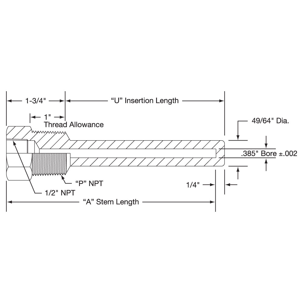 Series 65 (.385″ Bore) for 1/4″ and 3/8″ Elements Van StoneThermowells are available in the following materials: Steel Brass 316 Stainless Steel 304 Stainless Steel Monel.