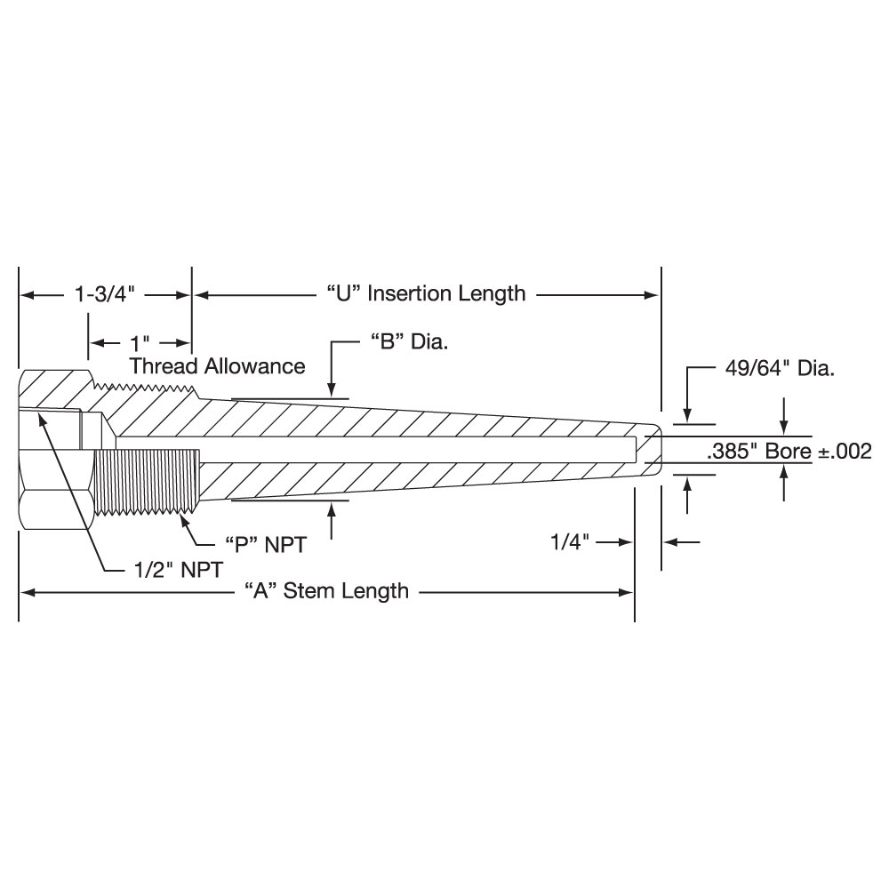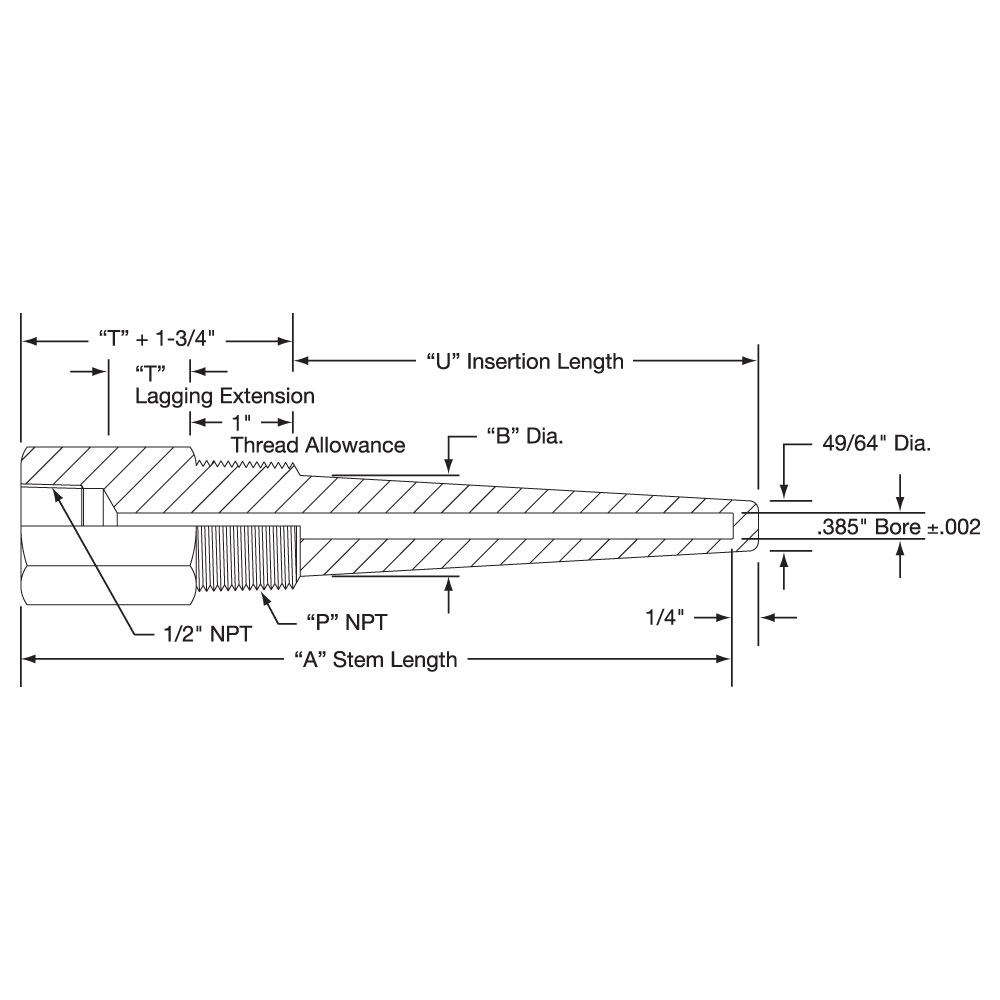 Series 45 Tapered Shank — Lagging Extension Type with .385″ Bore for a 3/8″ Diameter Element Heavy Duty ThreadedThermowells are available in the following materials: Steel Brass 316 Stainless Steel 304 Stainless Steel Monel.